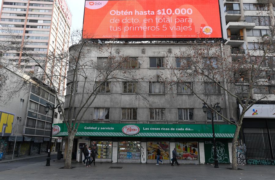 An outdoor screen showing advertisement of DiDi Chuxing is seen in Chile's capital Santiago, Aug. 6, 2019. (Xinhua/Jorge Villegas)