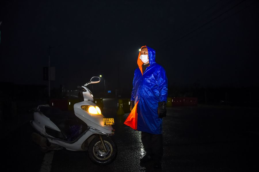 Peng Mouqiang prepares to leave for his shift at an epidemic prevention point of Jiefang Community in Yangdian Town, Xiaogan City, central China's Hubei Province, Feb. 27, 2020. (Xinhua/Hu Huhu)