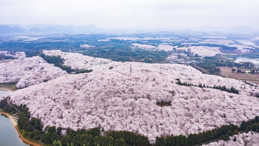 Aerial photo taken on March 12, 2020 shows the scenery of cherry blossoms in Guian New District, southwest China's Guizhou Province. (Xinhua/Tao Liang)■