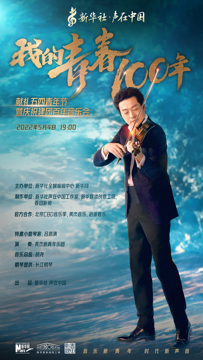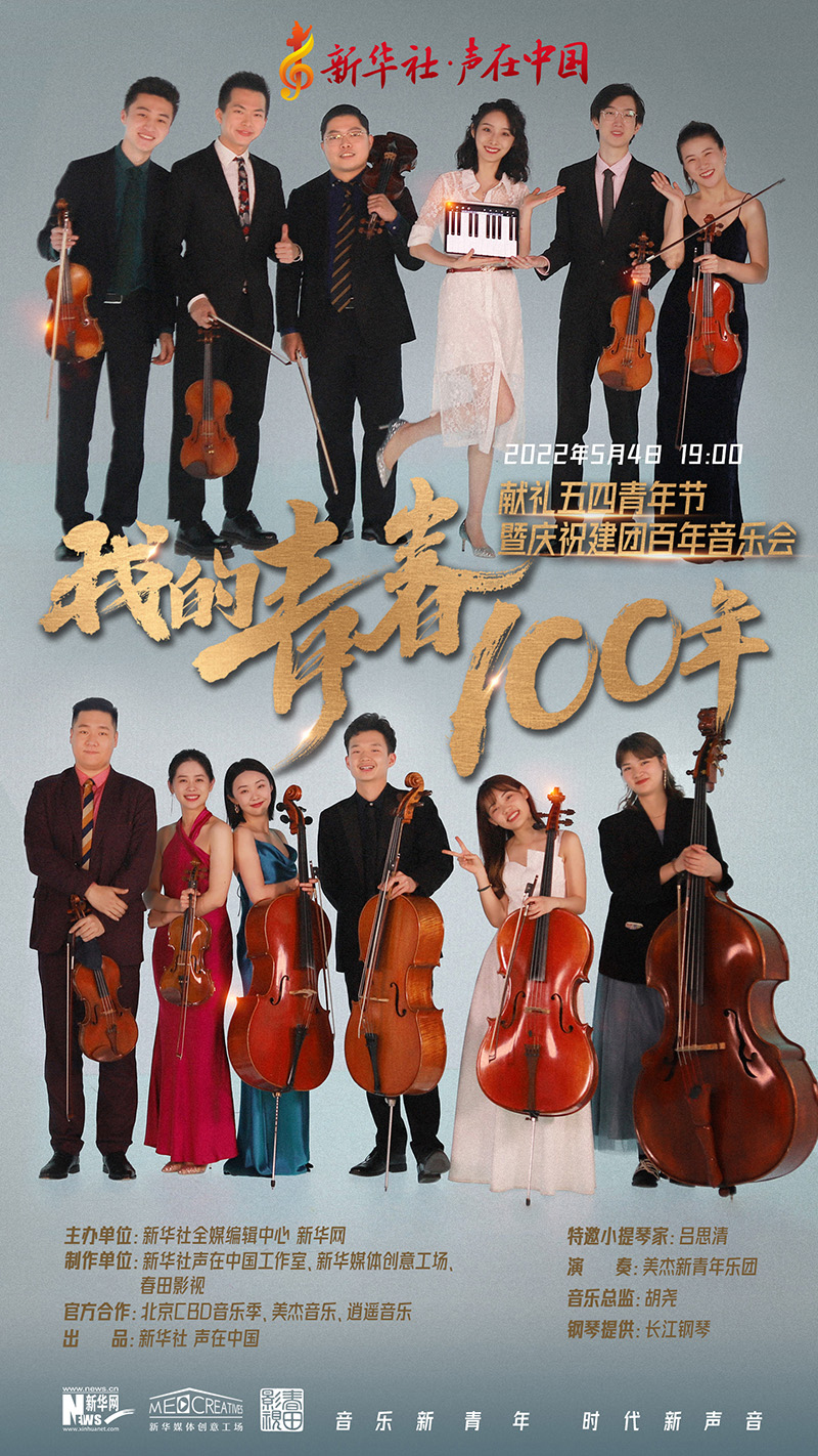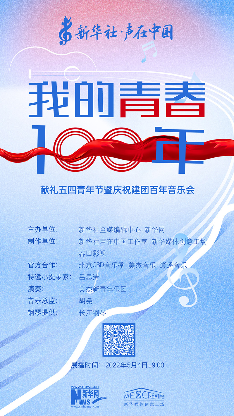弘揚五四精神,奏響青春贊歌。由新華社全媒編輯中心、新華網聯合主辦,新華社聲在中國工作室、新華媒體創意工場、春田影視共同制作的新華社聲在中國五四特輯——“我的青春100年”獻禮五四青年節暨慶祝建團百年音樂會將于5月4日19:00線上展播。