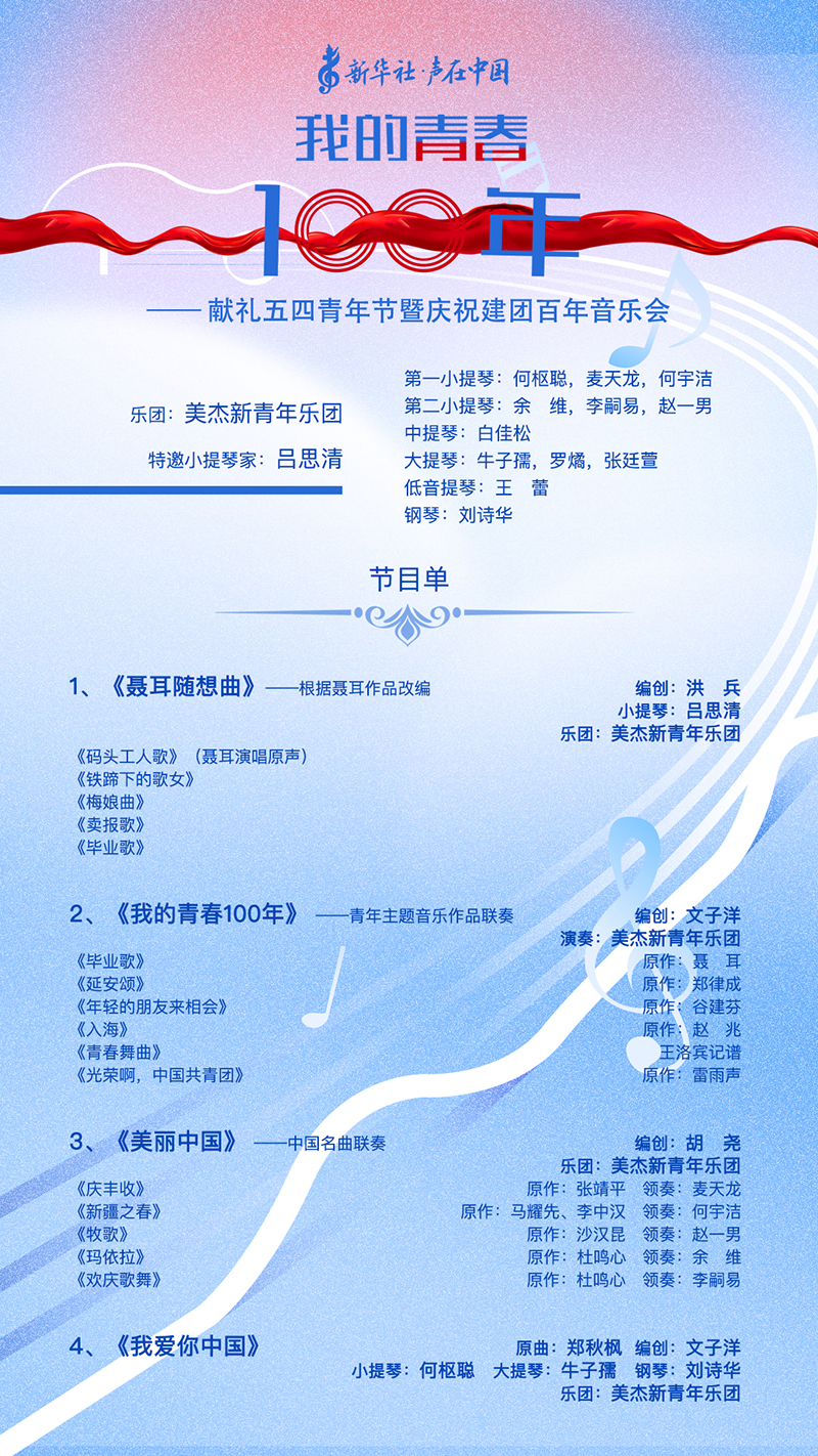 本次音樂會曲目內容由美杰音樂、逍遙音樂精心策劃,將于5月4日19:00,在新華社客戶端、新華網客戶端、新華社虎牙、新華社B站、新華社知乎、新華網微博、新華網視頻號、新華網抖音號、新華網B站、新華網快手同步展演。