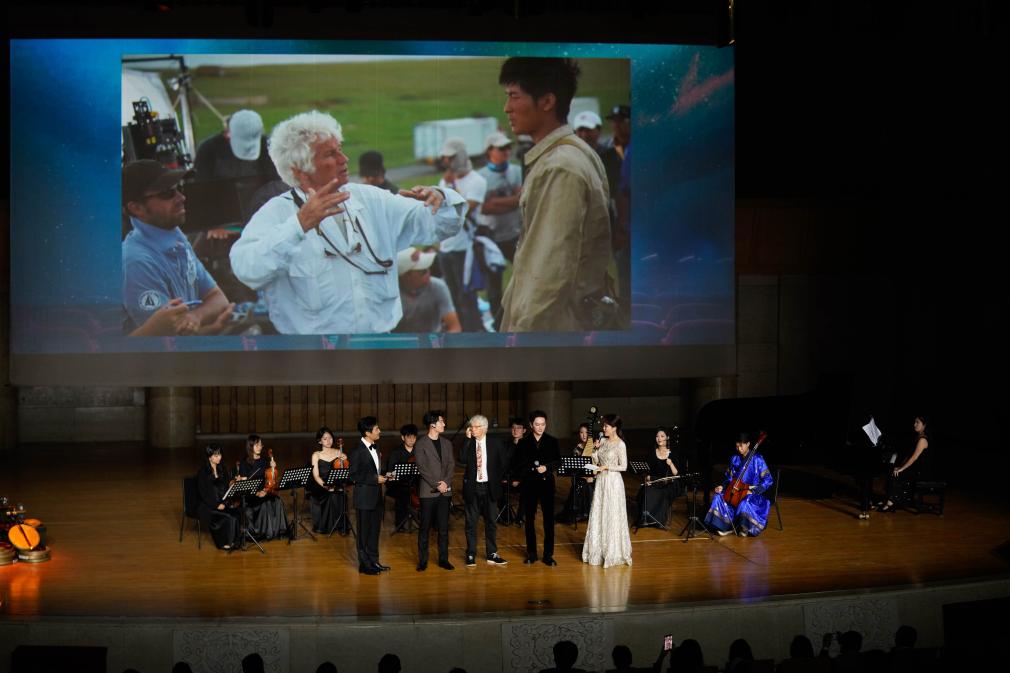 9月22日,電影《狼圖騰》導演讓·雅克·阿諾(前排左二)與演員馮紹峰(前排右二)、竇驍(前排左一)在音樂會上互動。新華社記者 謝晗 攝