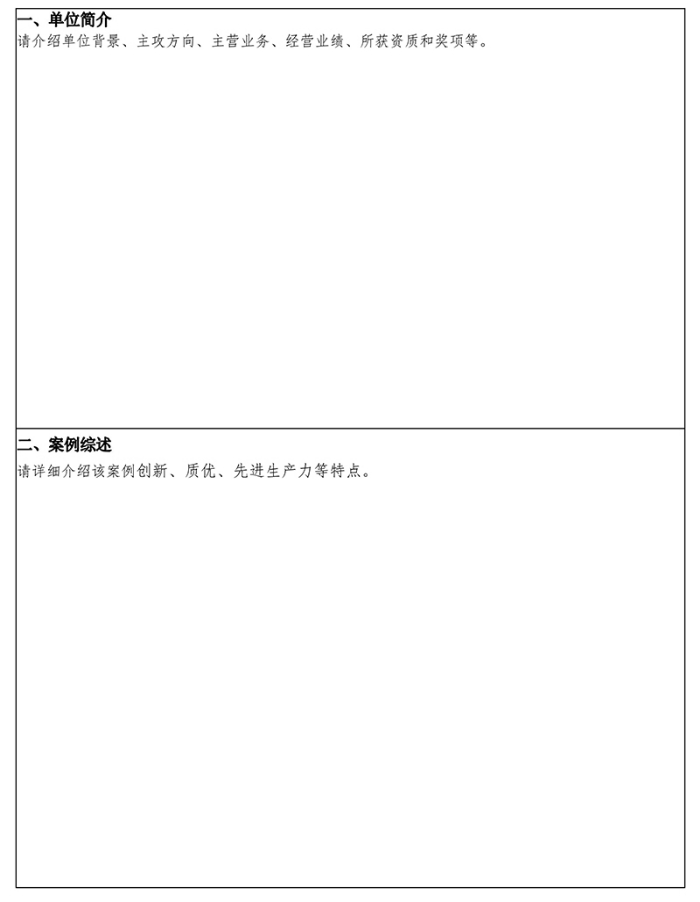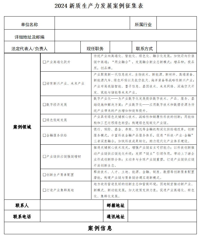 4、《2024新質生產力發展案例征集表》須按照表格進行填寫,案例情況敘述準確、邏輯性強、充分展現“創新”、“質優”、“先進生產力”的特點(單篇案例字數1500-2000字,文字、圖片結合);