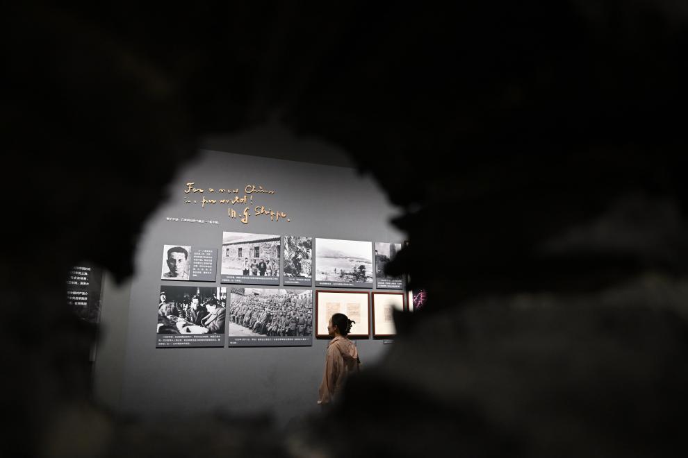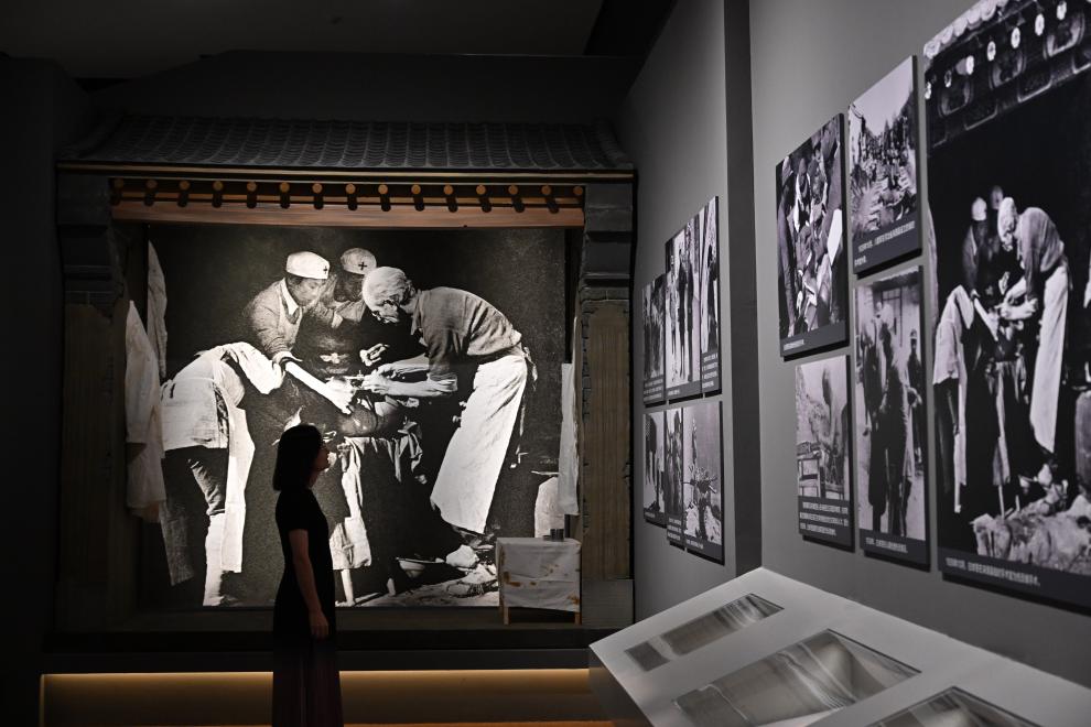 9月7日,在中國國家博物館,一名媒體人員在參觀白求恩的照片。