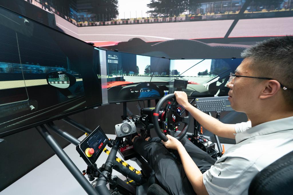 9月11日,參觀者在體驗六自由度賽車模擬器。