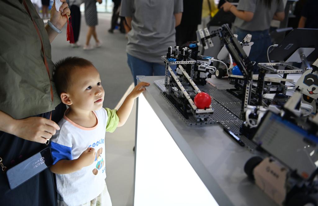 9月11日,在服貿會教育服務專題展區,一名小朋友在猿編程展臺觀看最新AI教育產品。