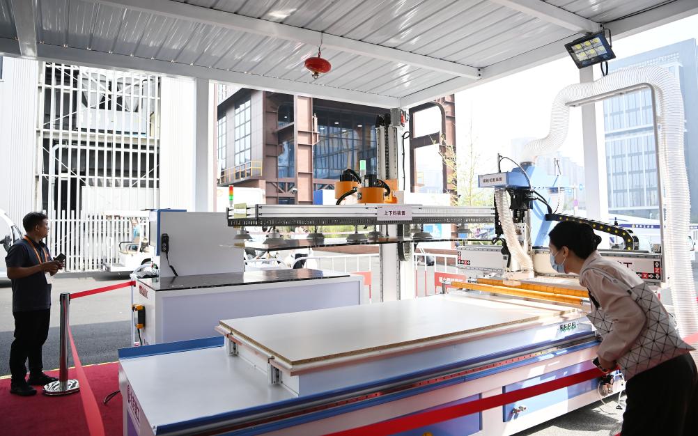 9月11日,在服貿會工程咨詢與建筑服務專題展區,參觀者(右)在北京建工展臺參觀智能模板無人工廠。