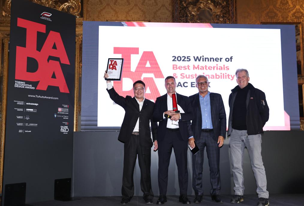 9月26日,在意大利都靈,榮獲“都靈汽車設計獎”最佳材料及可持續發展獎的江淮“釔為3”代表領獎。