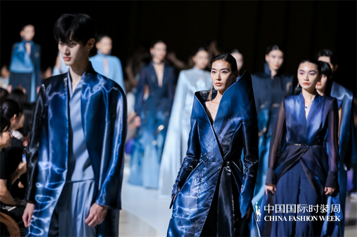 “心織華境”強調衣即心像。唐宋詩意與東方符號被注入紗線與繡紋,鶴影、修竹、星圖在布面重生。鎖鏈繡、金線微繡等工藝呈現細膩情感,飄逸長裙與利落西裝之間的張弛,展現女性的溫婉與堅毅。服飾成為“日常與儀式”的橋梁,幫助穿者與自我對話。