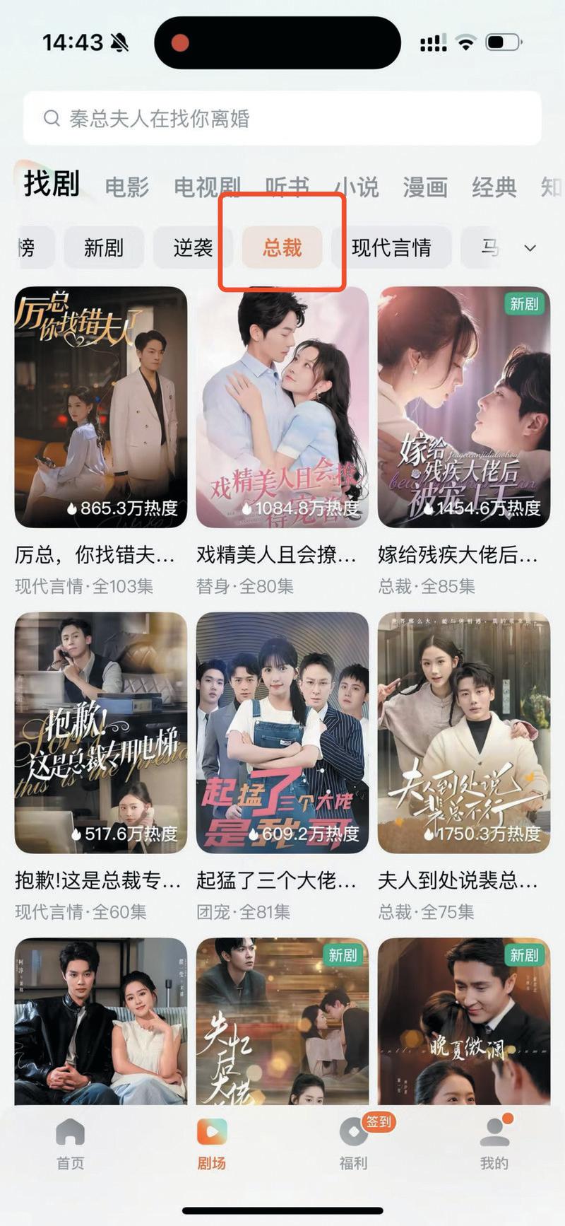 紅果短劇APP(應用程序)設置“總裁”類別。 平臺截圖