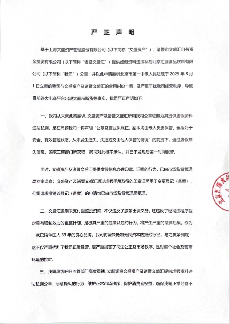在最新聲明中,匯源果汁表示,上海文盛資產管理股份有限公司(簡稱“文盛資產”)、諸暨市文盛匯通過提供虛假資料違法私刻匯源果汁公章,并以此申請撤銷北京市第一中級人民法院于2025年8月1日立案的匯源果汁與文盛資產及諸暨文盛匯的合同糾紛一案,以及嚴重干擾公司經營秩序,導致目前各大電商平臺出現大面積斷貨。