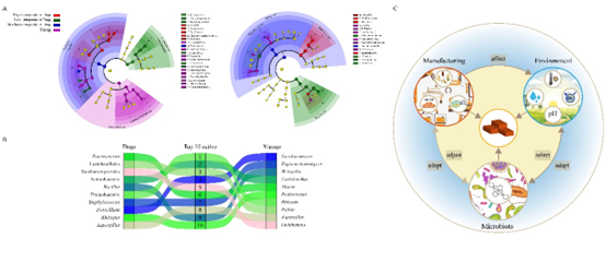 圖1 不同曲中微生物群落結構(A)、功能微生物(B)及群落形成機制(C)