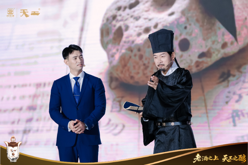 發布會現場,《天工開物》元素如流動的文化血脈貫穿始終。外場的竹簡卷軸陣列與活字印刷裝置,將“乃粒”“曲蘗”等釀酒篇章轉化為可觸摸的歷史肌理——竹簡上鐫刻著“凡釀酒必資曲藥成信”的古籍原文,活字模塊拼貼出“天工開物”“拾貳年陳”等核心概念,形成時空交織的文化場域。內場的沉浸式舞臺上,演員化身為宋應星與當代釀酒師,在“天人共釀”的對話中,重現典籍中“水泉必香,曲蘗必時”的釀造智慧。當“明代科學家”手持《天工開物》竹簡,與現代釀酒師的陶壇、曲塊形成跨時空呼應,舞臺中央的巨型沙漏緩緩流淌,象征著三百年工藝傳承的時間重量。
