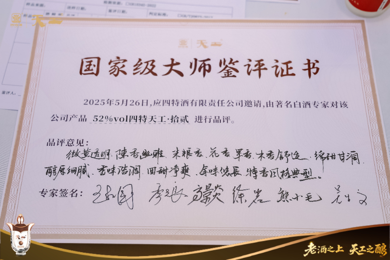 在5月26日上午舉行的國家級大師鑒評會上,由王新國、季克良、高景炎等業內重量級專家組成的評審團現場鑒評樣酒,并一致給予“微黃透明、陳香幽雅、米糧香、果香、木香舒適,入口綿甜甘潤,酒體醇厚細膩、香味諧調、回甜凈爽、余味悠長”的高度評價,認為其為特香風格典型之作。