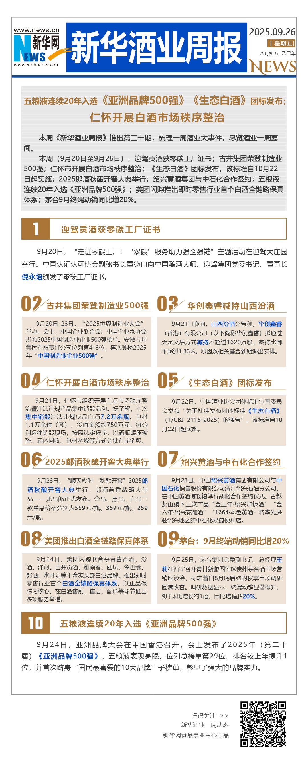 本周(9月20日至9月26日),迎駕貢酒獲零碳工廠證書;古井集團榮登制造業500強;仁懷市開展白酒市場秩序整治;《生態白酒》團標發布,該標準自10月22日起實施;2025郎酒秋釀開窖大典舉行;紹興黃酒集團與中石化合作簽約;五糧液連續20年入選《亞洲品牌500強》;美團閃購推出即時零售行業首個白酒全鏈路保真體系;茅臺9月終端動銷同比增20%。