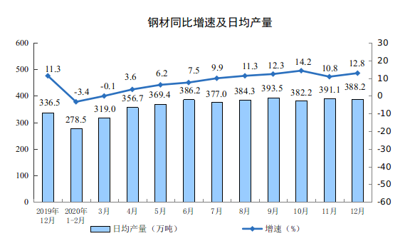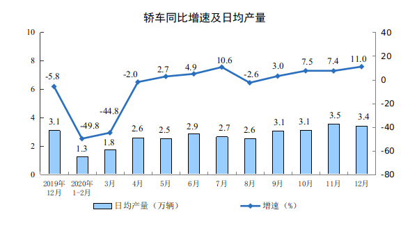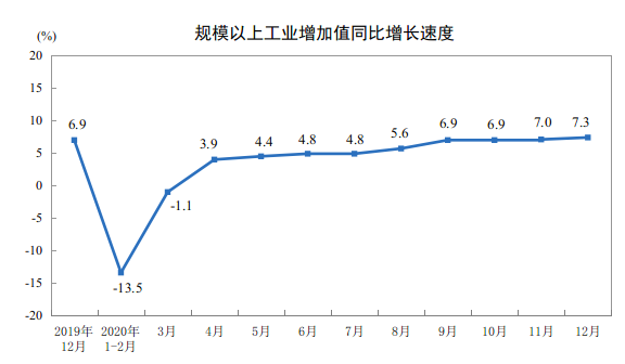 12月份,規模以上工業增加值同比實際增長7.3%(以下增加值增速均為扣除價格因素的實際增長率),增速較11月份加快0.3個百分點。從環比看,12月份,規模以上工業增加值比上月增長1.10%。2020年,規模以上工業增加值比上年增長2.8%。