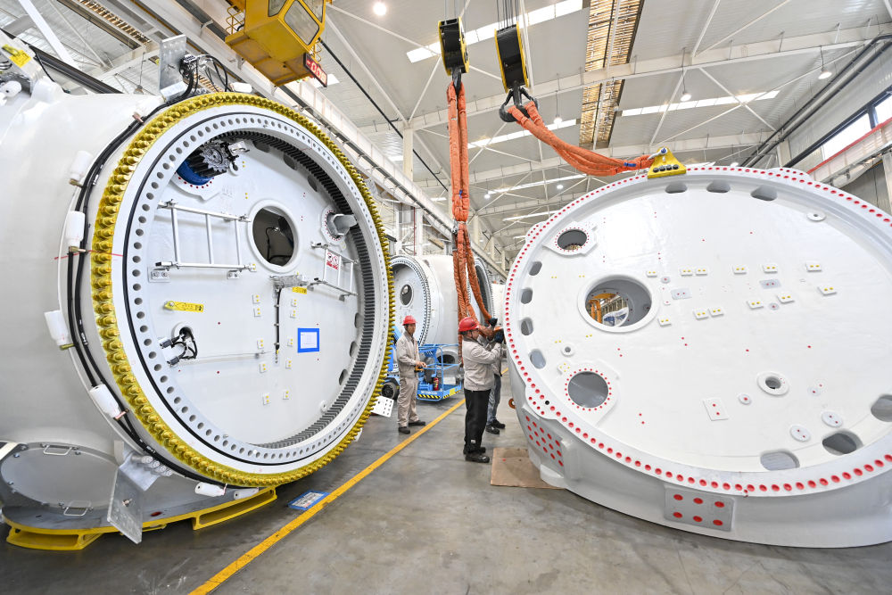 2025年9月24日,工人在位于山西轉型綜合改革示范區的太重集團新能源產業園區吊運風電裝備。新華社記者 楊晨光 攝