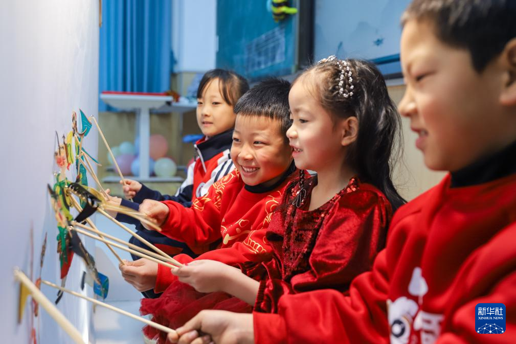 2月14日,學生在山東省青島崇禮小學體驗皮影戲表演。