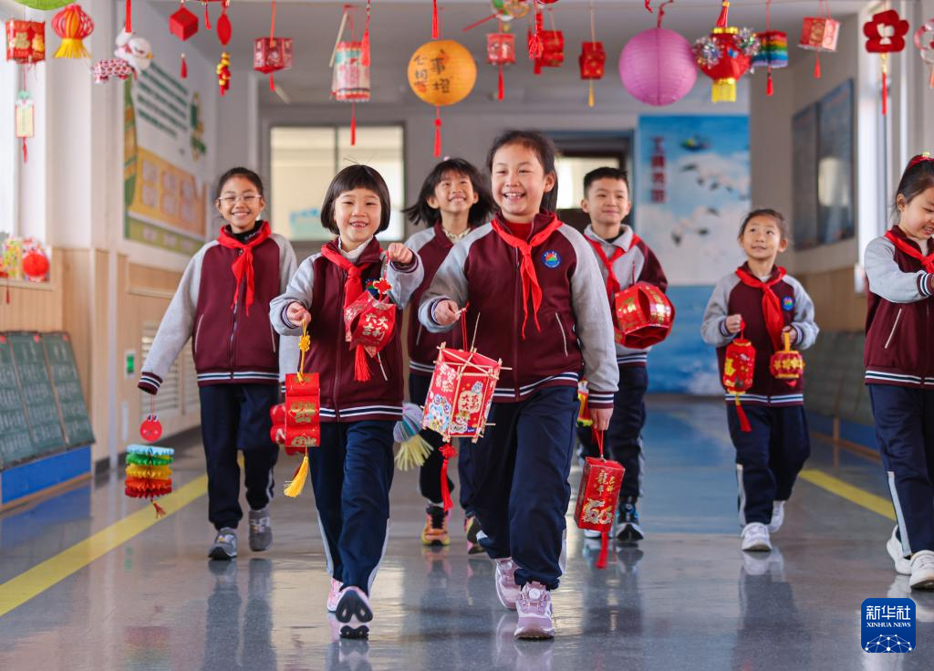 2月14日,在山東省榮成市實驗小學,學生們展示自己的手工作品。