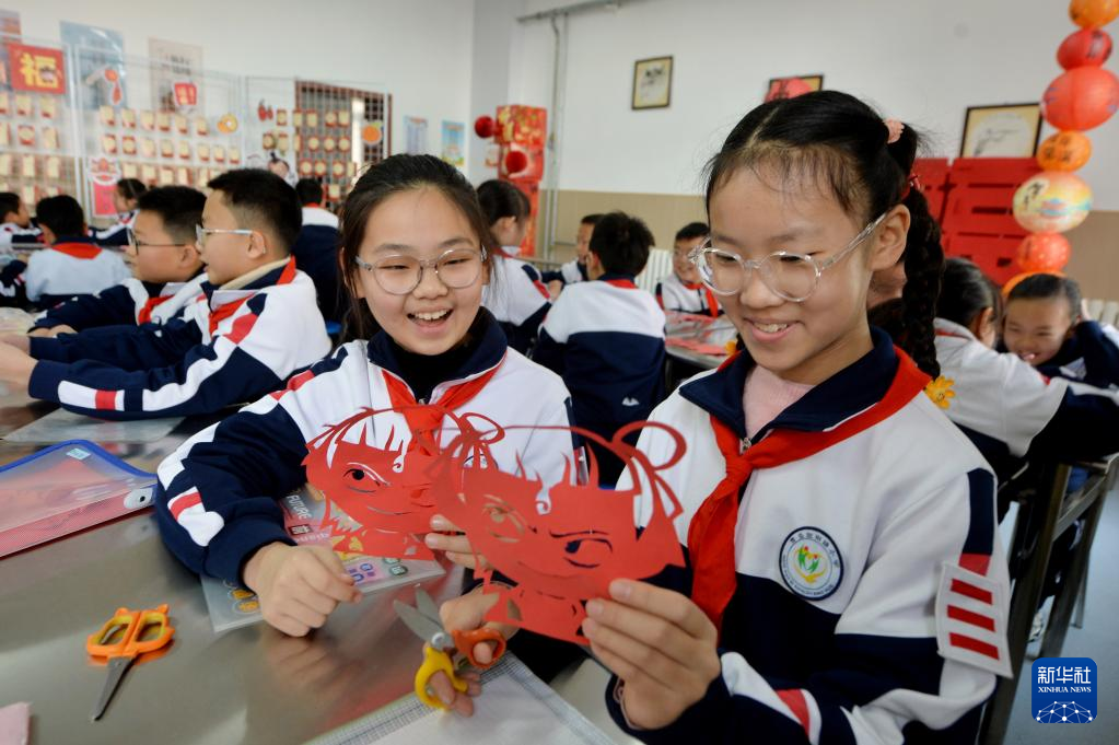 2月14日,兩名學生在山東青島宜陽路小學“傳統文化潤童心”主題活動中學習“哪吒”剪紙。