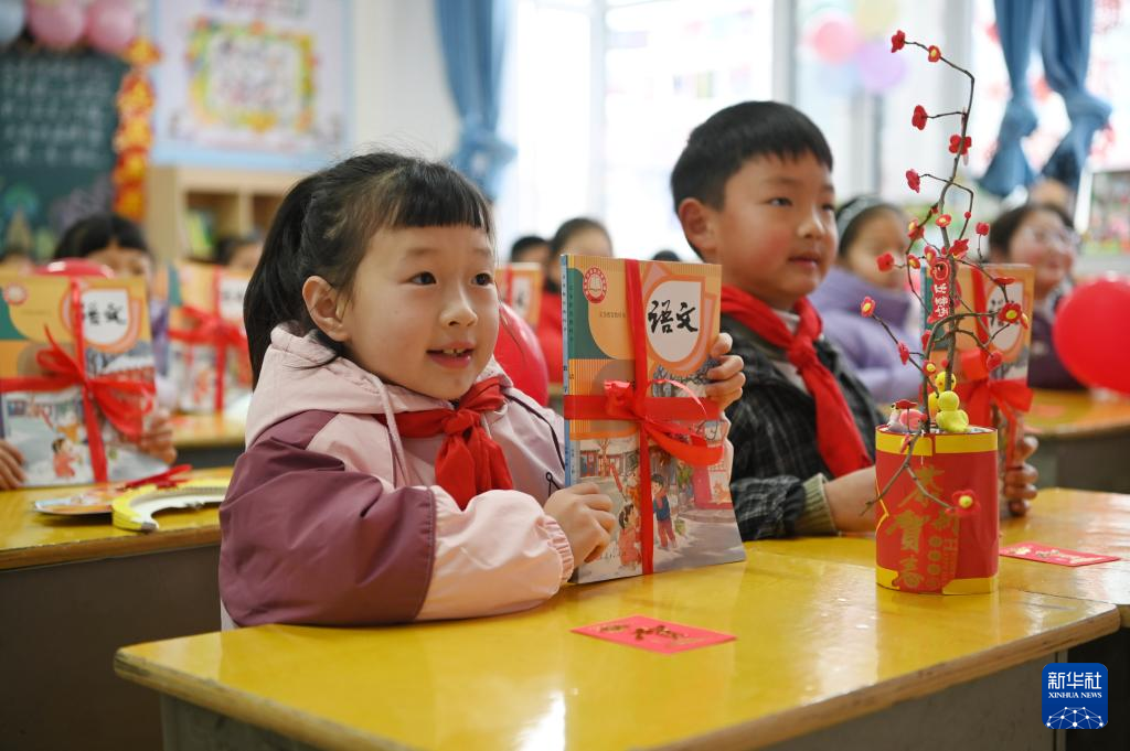 2月14日,在河南省沁陽市朱載堉學校,一年級學生展示領到的新課本。
