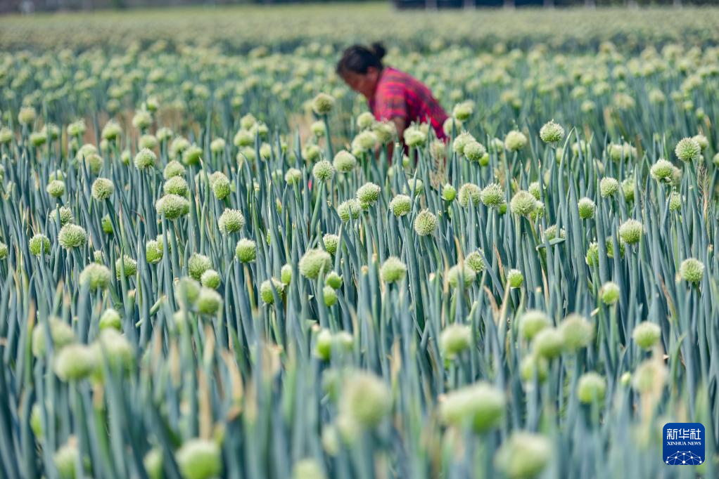 5月21日,在山東省青州市黃樓街道孫家村,農民在管護大蔥。新華社發(王繼林攝)