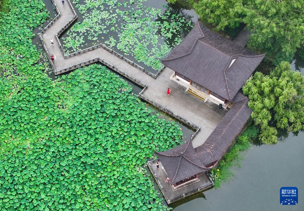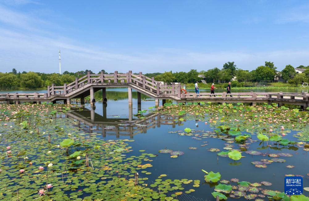 游客在浙江省湖州市長興縣泗安鎮仙山湖國家濕地公園觀賞睡蓮(無人機照片)。