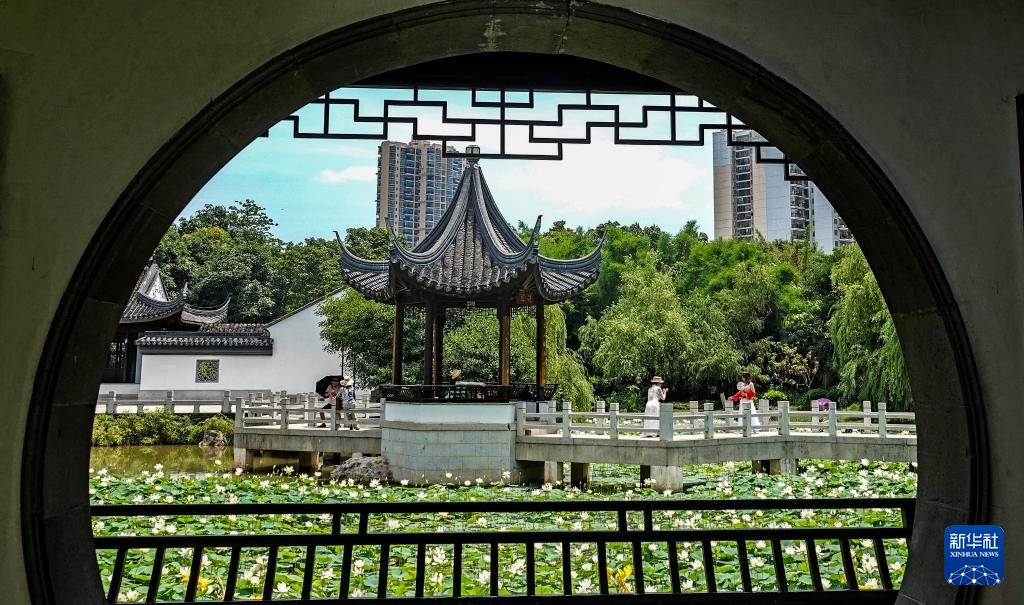 游人在廣西南寧市花卉公園的荷塘觀賞荷花。