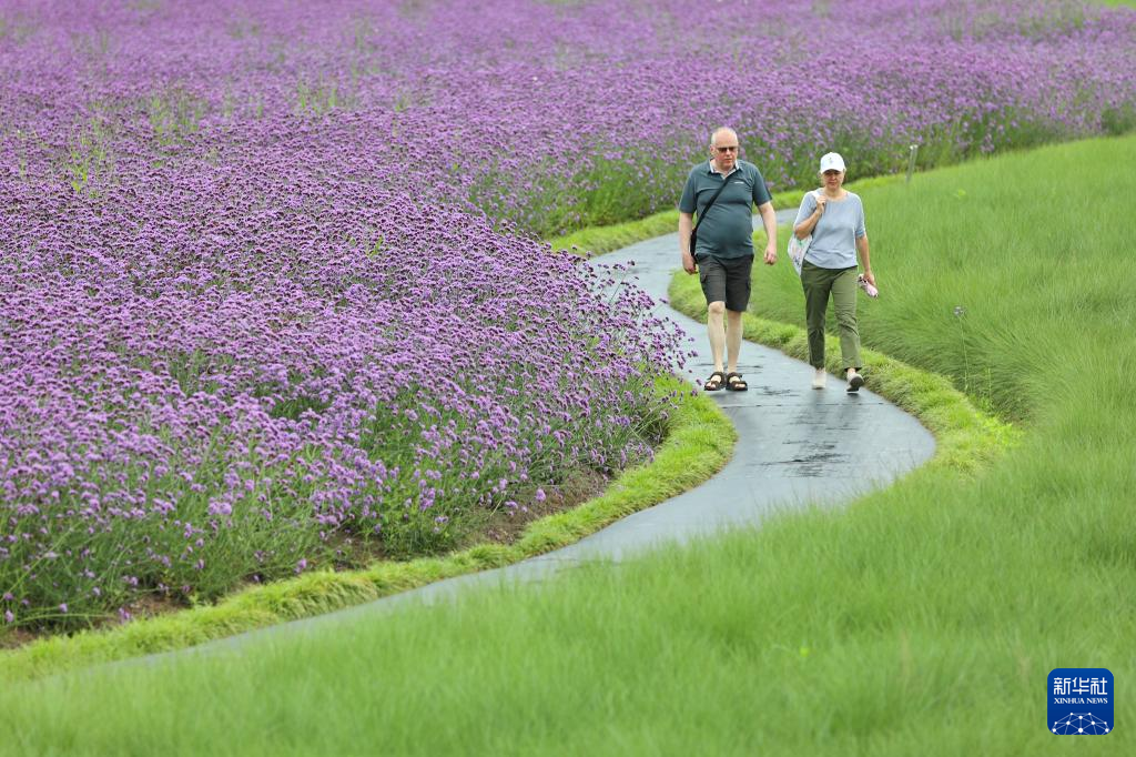 游客在浙江省嘉興經濟開發區姚家蕩公園馬鞭草花海中休閑。