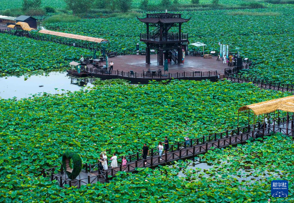 游客在江蘇省興化市萬畝荷塘景區賞荷游玩(無人機照片)。