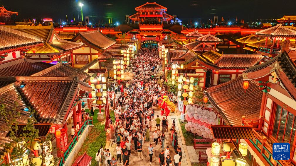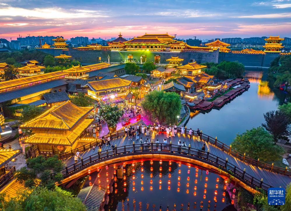 湖北省襄陽市唐城景區夜景璀璨,吸引游客前來游玩(無人機照片)。