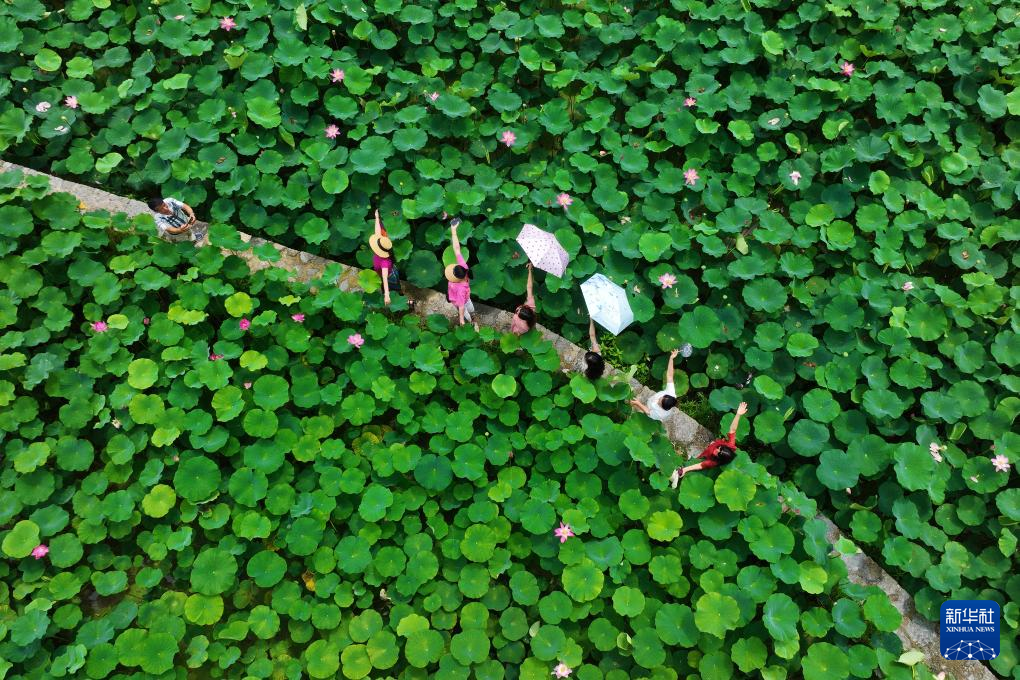 7月6日,游客在重慶市黔江區小南海鎮新建村土家十三寨荷田里賞荷游玩(無人機照片)。