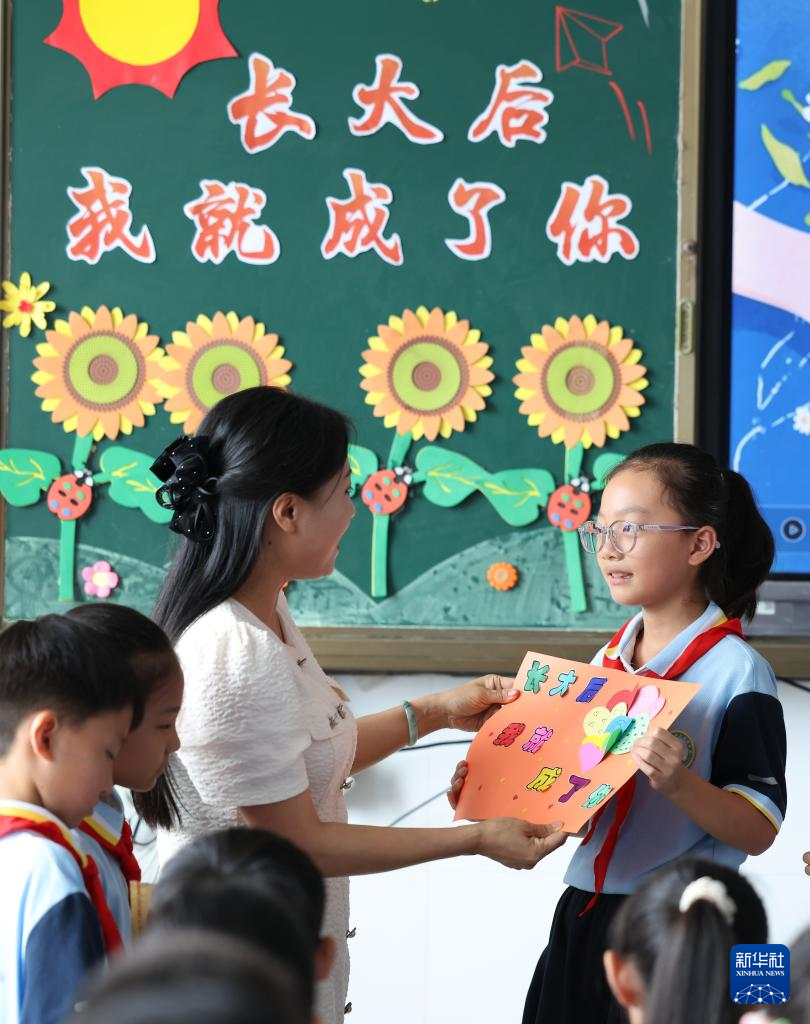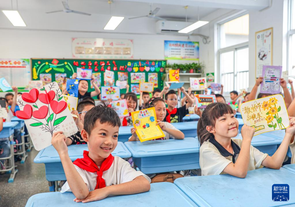 9月10日,山東省臨沂市郯城縣第三實驗小學學生將自己制作的教師節賀卡送給老師。