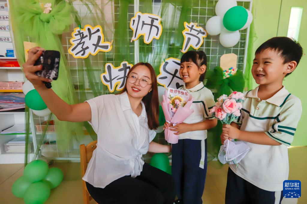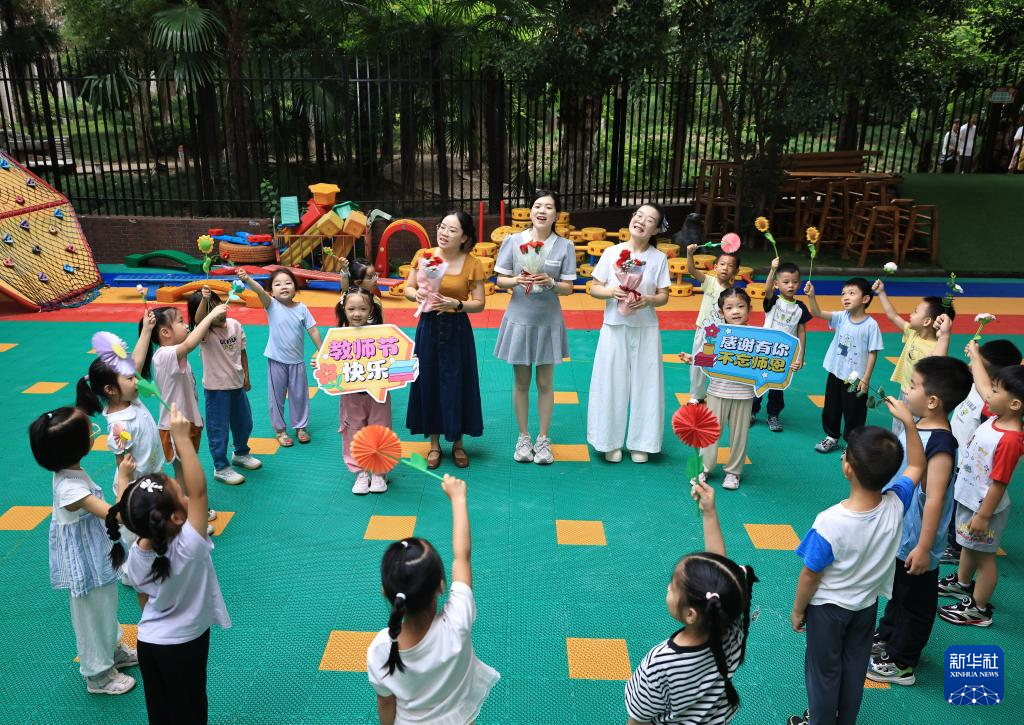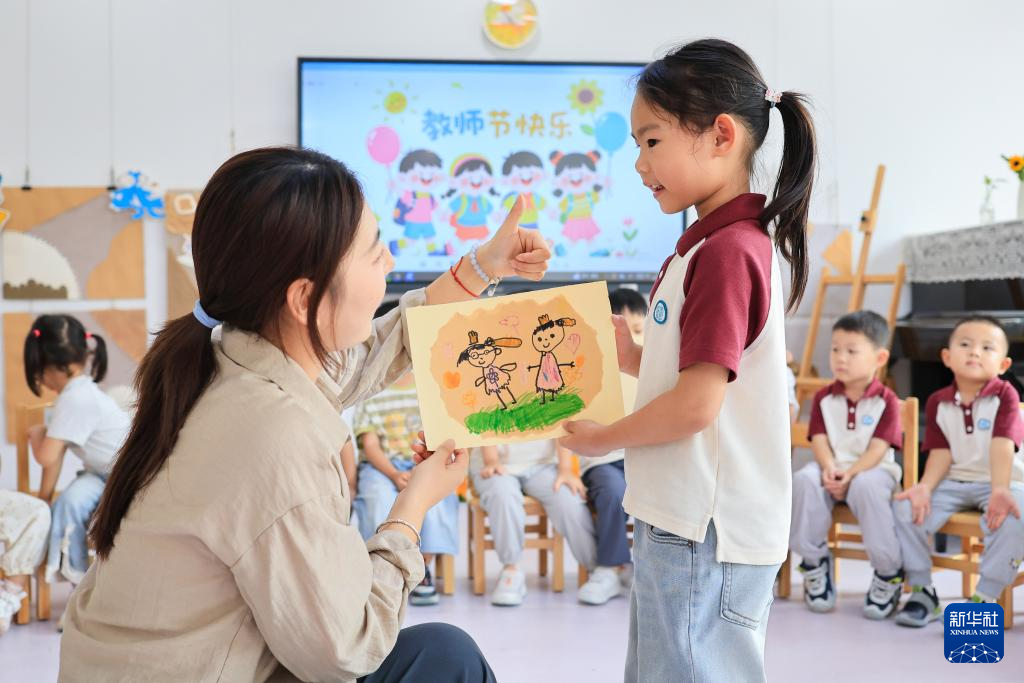 9月10日,在湖北省武漢市洪山區實驗寄宿幼兒園,小朋友為老師送上節日祝福。