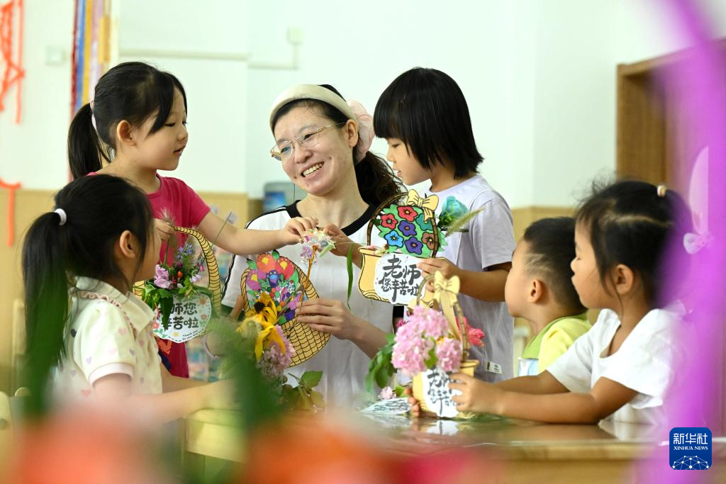 9月10日,在河北省石家莊市新華區華北幼兒園,孩子們為老師送上制作的花籃和祝福。