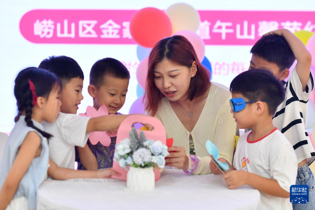 9月10日,在山東省青島市嶗山區金家嶺街道午山馨苑幼兒園開展的教師節活動上,小朋友為老師獻上自制的祝福賀卡。