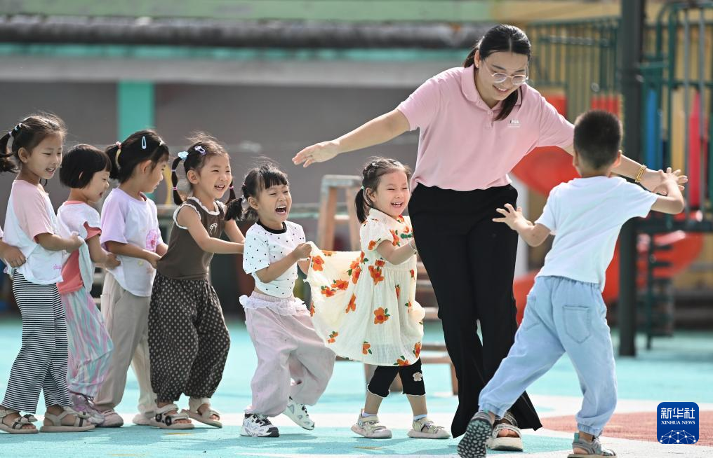 9月10日,在山東省滕州市西崗鎮中心幼兒園(柴里)分園,老師和小朋友一起玩“老鷹捉小雞”趣味游戲。
