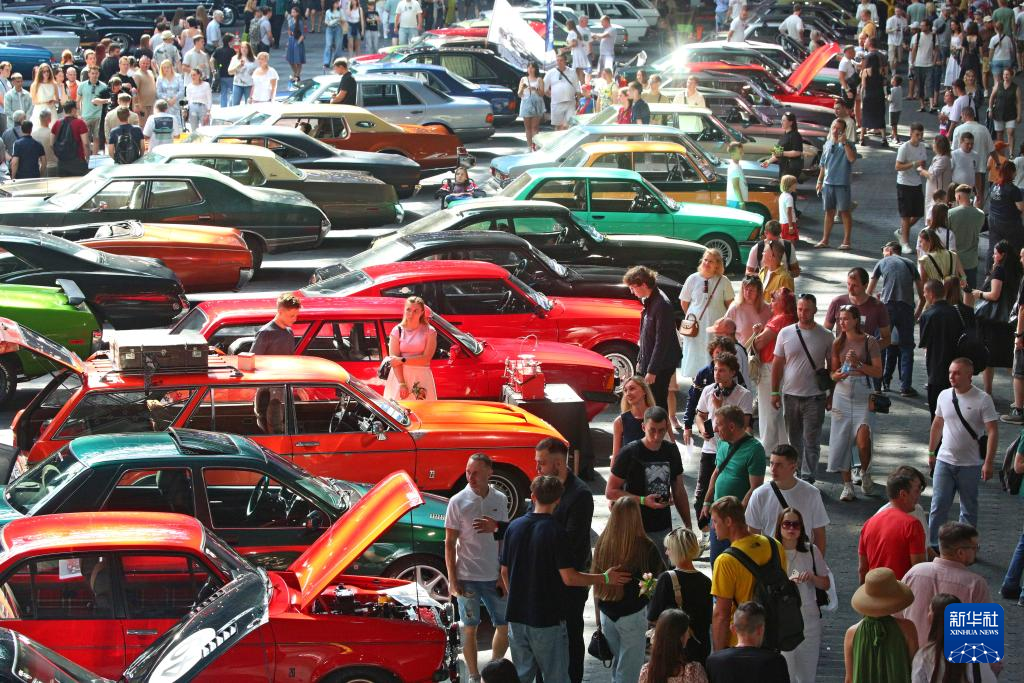8月30日,在白俄羅斯明斯克,人們在復古汽車展上參觀。