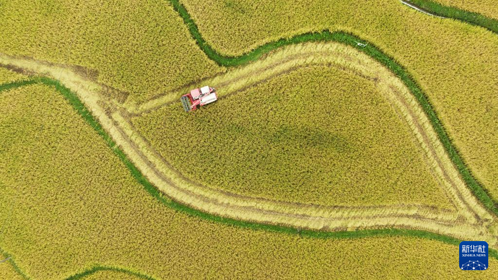 9月11日,農機手駕駛聯合收割機在貴州省綏陽縣旺草鎮水稻種植基地里收割水稻(無人機照片)。