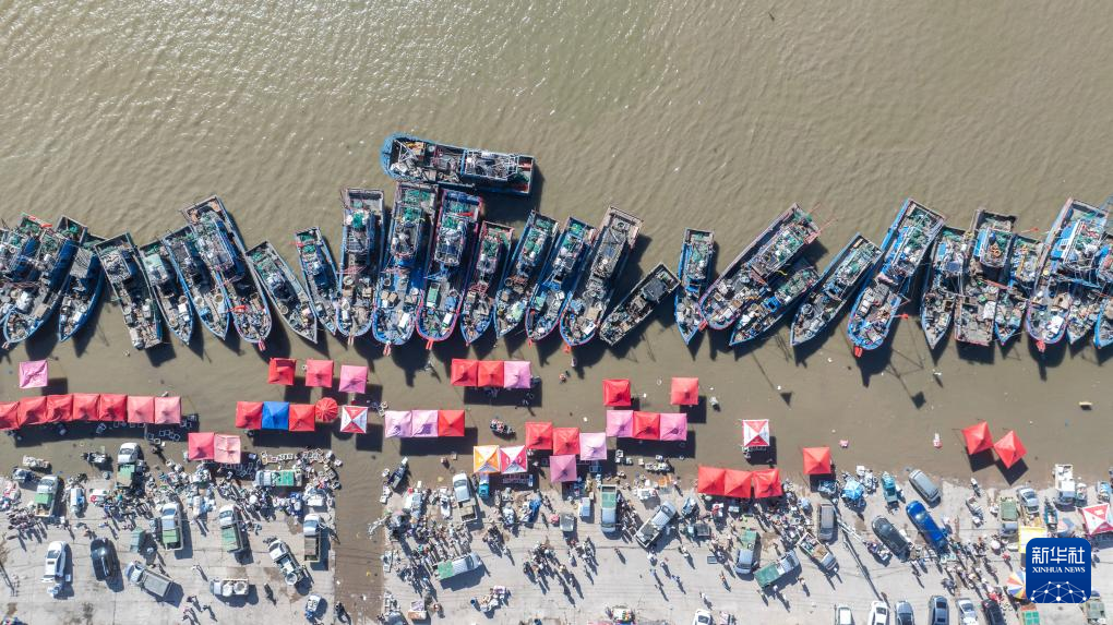 9月8日,滿載而歸的漁船停靠在河北省唐山市豐南區黑沿子中心漁港碼頭(無人機照片)。