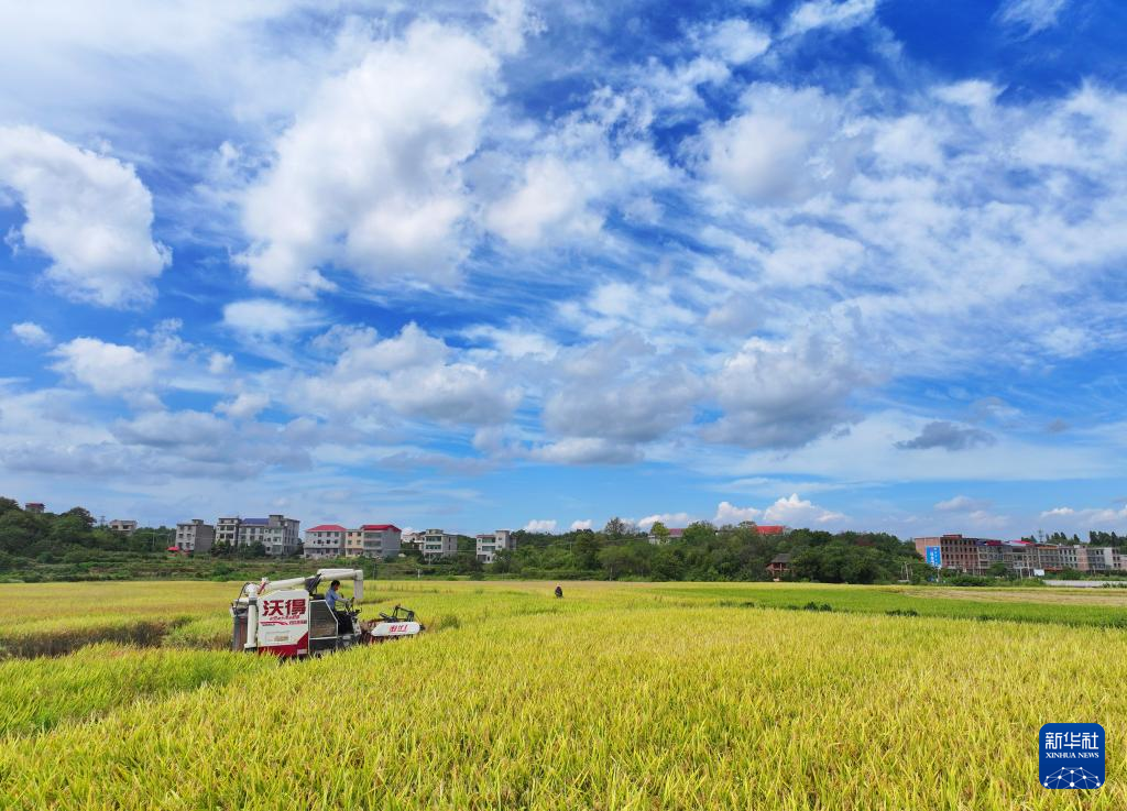 9月11日,湖南省衡陽市衡東縣石灘鄉村民駕駛農機收割稻谷(無人機照片)。