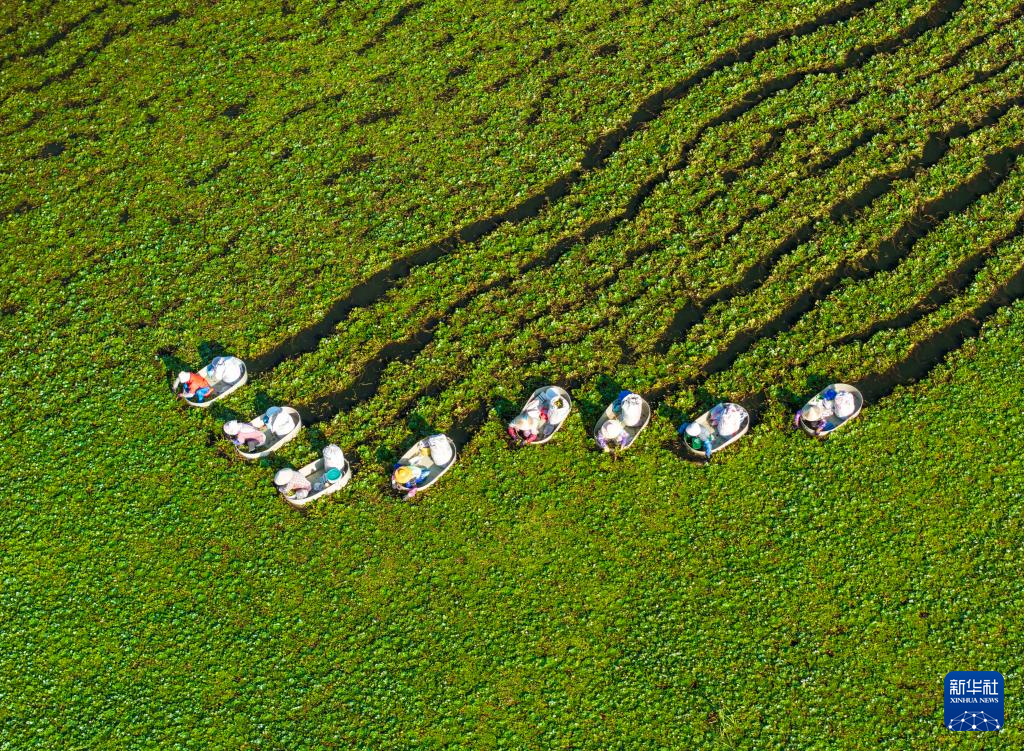 9月10日,村民在江蘇省泰州市海陵區蘇陳鎮張家院社區采摘菱角(無人機照片)。