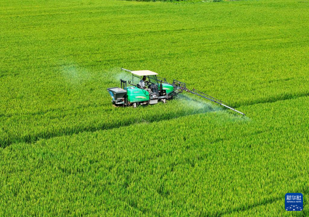 9月10日,江蘇省泰興市濟川街道眾賢村農民駕駛植保機開展水稻病蟲害防治作業(無人機照片)。