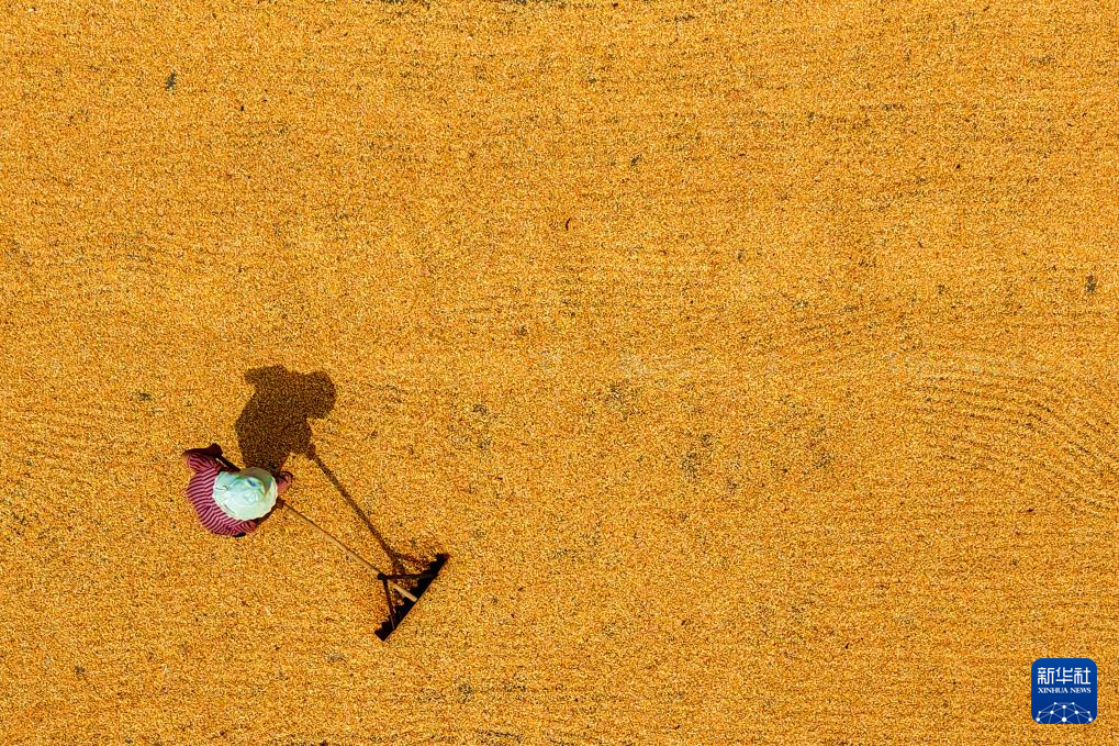 9月11日,湖南省衡陽市衡東縣石灘鄉村民駕駛農機收割稻谷(無人機照片)。