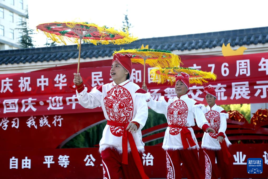 9月25日,在河南省洛陽市汝陽縣劉伶廣場,汝陽縣牡丹藝術團在表演陜西大秧歌《紅歌大聯唱》。
