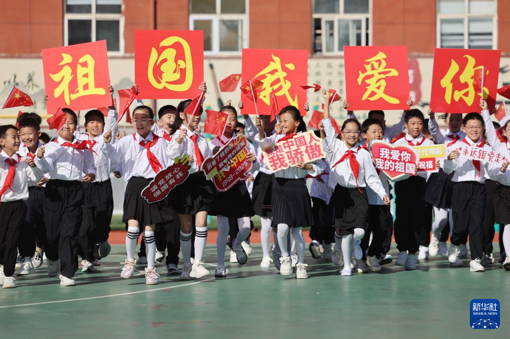 9月25日,在山東省臨沂市沂南縣,第三實驗小學的小學生們參加“祝福祖國”活動。