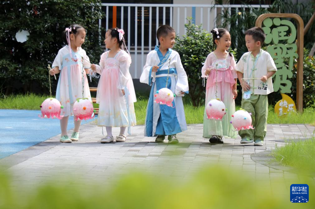 9月25日,在江蘇省蘇州市姑蘇區平潤實驗幼兒園,小朋友提著自制中秋花燈歡樂游園。