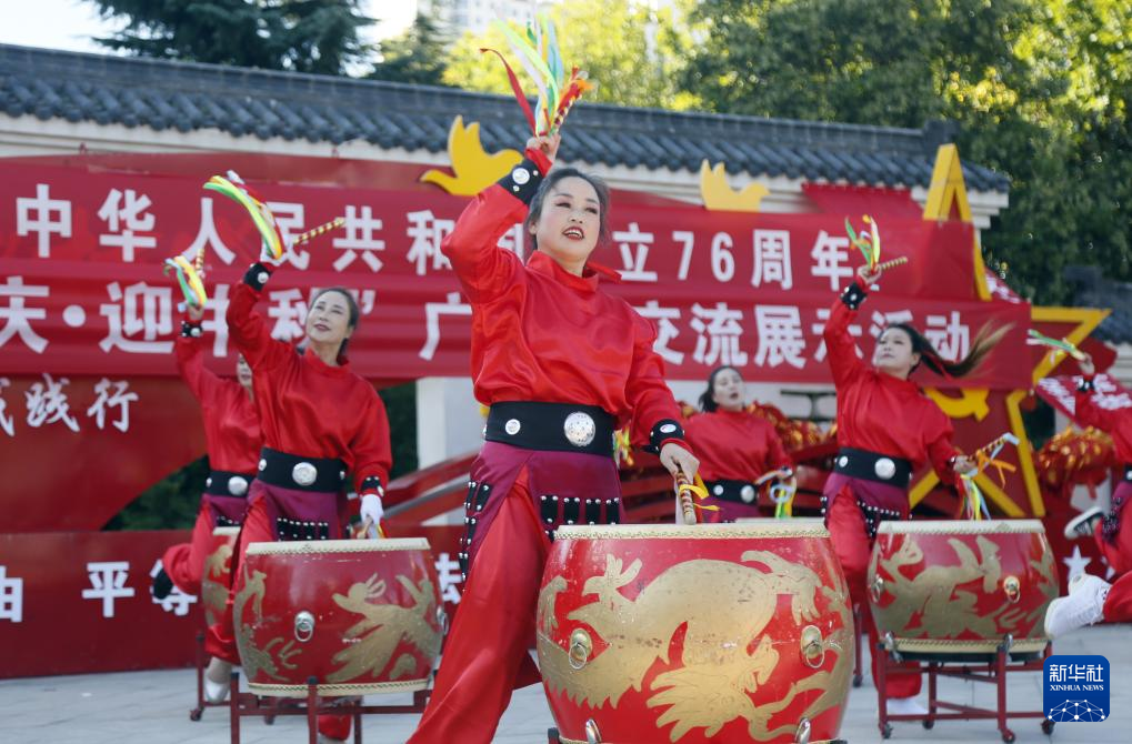 9月25日,在河南省洛陽市汝陽縣劉伶廣場,汝陽縣牡丹藝術團在表演音樂鼓《中華魂》。
