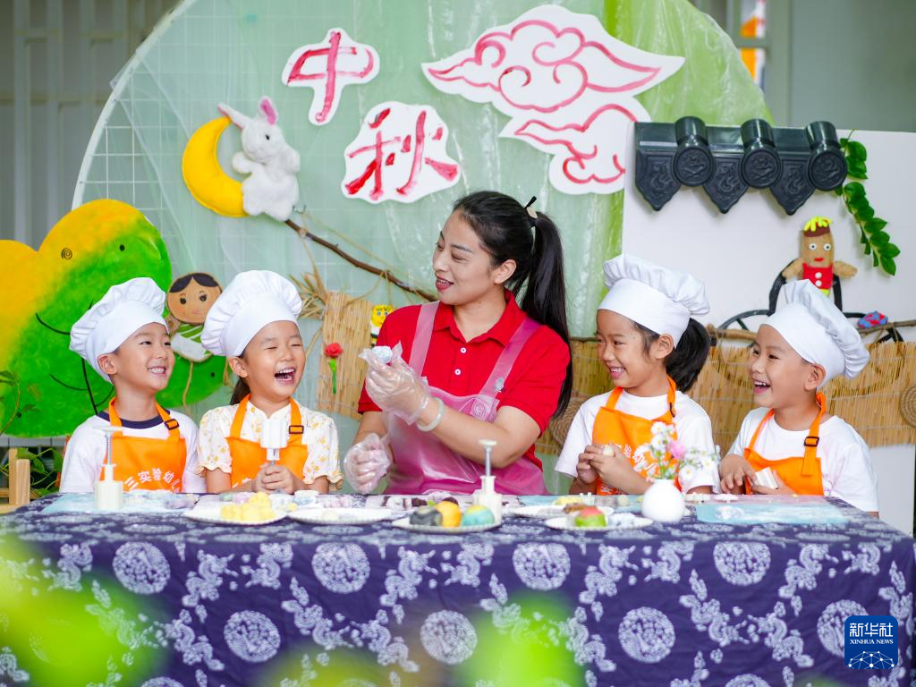 9月25日,在江蘇省泰州市姜堰區第三實驗幼兒園,小朋友們在老師的指導下學習做月餅。