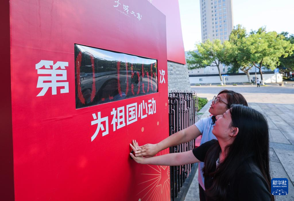 9月25日,在浙江省嘉興市南湖區建設街道的子城城墻邊,市民參加我為祖國心動打卡活動。